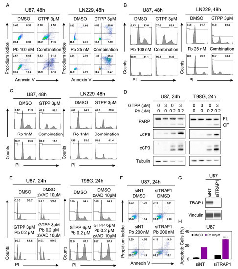 Combined inhibition of TRAP1 and HDACs enhanced activation of a cell death with apoptotic features, including cleavage of caspases. (A) U87 and LN229 cells were treated with the indicated concentration of gamitrinib, panobinostat or the combination of both for 48h. Thereafter, cells were labeled with annexin/propidium iodide (PI) dye and analyzed by multi-parametric flow cytometry. Shown are representative flow plots; (B,C) U87 and LN229 cells were treated with the indicated concentrations of gamitrinib, panobinostat/romidepsin or the combination of both for 48h. Thereafter, cells were labeled with propidium iodide (PI) dye and analyzed by flow cytometry. Shown are representative flow plots; (D) Standard western blots of cell lysates of U87 and T98G treated with gamitrinib, panobinostat or the combination of both for 24 h. Tubulin is used as a loading control. FL: full length, CF: cleaved fragment; (E) U87 and T98G cells were treated with the combination treatment of gamitrinib and panobinostat in the presence or absence of zVAD for 24h. Thereafter, cells were labeled with propidium iodide (PI) dye and analyzed by flow cytometry. Shown are representative flow plots; (F–H) U87 GBM cells were transfected with scrambled or TRAP1 specific siRNA and treated with panobinostat for 24h. Knockdown efficiency was confirmed by protein capillary electrophoresis. Vinculin serves as a loading control. Thereafter, cells were labeled with Annexin/PI dye and analyzed by multi-parametric flow cytometry (n = 3). Shown are means and SD. Statistical significance was determined by two-tailed Student’s t-test. **** p < 0.001.