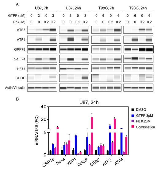 The induction of cell death and the modulation of Bcl-2 family members is often preceded and regulated by the so called integrated stress response, which may be induced by a number of factors, including loss of energy and the accumulation of misfolded proteins. To this end, we treated established U87 and T98G GBM cells with vehicle, gamitrinib, panobinostat or the combination of both for either 7 h or 24 h (Figure 4A). Thereafter, proteins were harvested and subjected to capillary electrophoresis. We noted an early increase in GRP78 protein levels accompanied by enhanced phosphorylation of eif2α predominantly evident in the combination treatment at 7 h (Figure 4A). Concomitantly, we also identified an increase in ATF4 and ATF3, respectively, which is in support with the general accepted notion that eif2α is upstream of ATF4 and when eif2α is phosphorylated it favors ATF4 translation and certain other stress related proteins. Downstream of ATF4 lies CHOP and we detected an increase in CHOP levels, especially in U87 cells (Figure 4A). It is noteworthy that the integrated stress response signaling was activated much faster by the combination treatment and at 24 h the difference between combination treatment and single treatment was not as prominent anymore, indicating this process is an early event (Figure 4A). We further validated on the transcriptional levels the activation of the integrated stress response as well (Figure 4B). To this purpose, U87 GBM cells were treated with vehicle, gamitrinib, panobinostat or the combination of both for 24 h. Following treatment, RNA was isolated and transcript levels for several factors related to the integrated stress response, including XBP1 and CEBPB (two additional down-stream modulators of the cellular stress response), were analyzed. Similarly, to the protein expression analysis, we noted mRNA increases of stress response related transcripts. From this analysis, it emerged that both ATF4 and ATF3 are up-regulated at the transcript level as well, suggesting that the resulting protein increase is not only related to enhanced and preferential translation but also linked to up-regulated transcription. This also included an increase in Noxa accompanied by an up-regulation of ATF4, potentially highlighting a transcriptional modulation of Noxa by ATF4 [16,17] (Figure 4B).