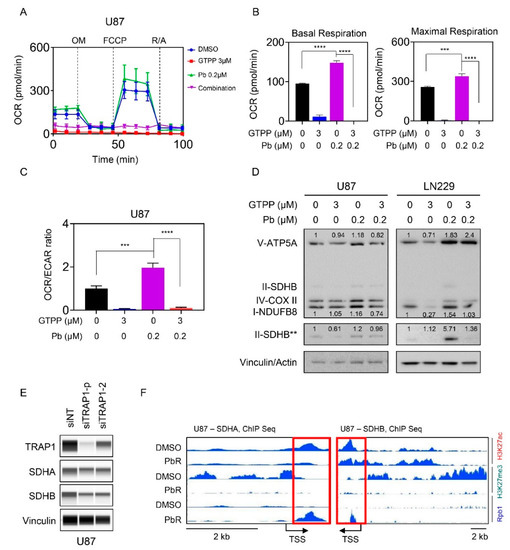 Based on the literature and our own work, the integrated stress response is known to be related to metabolism and our earlier work demonstrated a role for gamitrinib as well as panobinostat in GBM metabolism [13,18]. Given that these effects are contrary to tumor cell respiration (i.e., panobinostat increases, whereas gamitrinib suppresses the oxygen consumption rate (OCR)) through disruption of the complex II of the respiratory chain (SDH), we hypothesized that gamitrinib might suppress panobinostat mediated increase in oxygen consumption rate. To address this question, we utilized the mitochondrial stress assay on the seahorse analyzer in U87 GBM cells. In this assay, basal OCR measurements are taken, followed by injection of oligomycin (ATP-production), FCCP (maximal respiration) and rotenone/antimycin (inhibition of mitochondrial respiration). After each injection of these compounds the OCR values are recorded. U87 GBM cells were treated with vehicle, gamitrinib, panobinostat or the combination of both (Figure 5A–C). Following treatment, the cells were subjected to extracellular flux analysis. Basal measurements, maximal respiration and the OCR/ECAR (extracellular acidification rate) ratio revealed an increase following treatment with panobinostat and a decrease with gamitrinib (Figure 5B,C). The increase of the OCR/ECAR ratio by panobinostat is in keeping with the reversal of the Warburg-effect, leading to suppression of ECAR and an increase of OCR. Importantly, gamitrinib reversed panobinostat mediated increase of basal OCR, maximal respiration and the OCR/ECAR ratio (Figure 5B,C). These data suggest that the combination treatment reduced energy metabolism in GBM cells. Next, we asked about the mechanism by which panobinostat facilitates an increase in OCR. While there are several possibilities, the first and foremost to consider are the expression levels of respiratory complexes. To this end, U87 and LN229 GBM cells were treated with vehicle, gamitrinib or the combination of both and following protein isolation analyzed for the expression levels of the five respiratory complexes (Figure 5D and Figure S6A–C). While we detected an increase of respiratory complexes following panobinostat treatment, gamitrinib counteracted this up-regulation, which is in agreement with our findings obtained on the seahorse analyzer (Figure 5D and Figure S6A–C). To validate that TRAP1 is directly involved in this phenomenon mediated by gamitrinib, we silenced TRAP1 in U87 cells by two specific siRNAs (Figure 5E). Following transfection, protein expression of both SDHA and SDHB was assessed by protein capillary electrophoresis, demonstrating that TRAP1 silencing sufficed to suppress these two proteins that are associated with complex two of the respiratory chain (Figure 5E). Previous findings from our group demonstrated that panobinostat up-regulated SDHA and SDHB following acute and chronic treatment with panobinostat and that the up-regulation is mediated on a transcriptional level [13]. Given that HDAC inhibitors affect the post-translational status of histones and histones regulate the accessibility of the chromatin we assessed the status of H3K27ac, H3K27me3 and RNA polymerase II (Rpb1) binding to the SDHA and SDHB locus by chromatin immunoprecipitation coupled with next generation sequencing of vehicle or panobinostat treated cells (Figure 5F). Regarding the SDHB locus, we noticed a modulation of H3K27ac and a striking reduction of the repressive histone mark, H3K27me3 in panobinostat exposed U87 cells (PbR). Consistently, this phenomenon was coupled with enhanced presence of Rbp1 at the transcriptional start site of SDHB, facilitating mRNA production of SDHB (Figure 5F). Similar findings were observed at the SDHA locus.