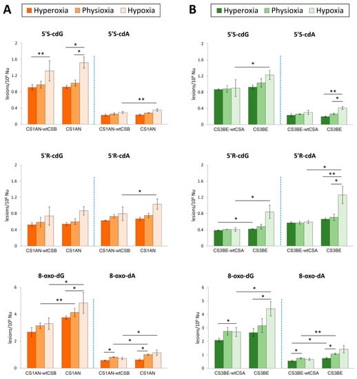 Statistical significance was observed in the increased values of 5′R-cdA (p = 0.027), 5′S-cdA (p = 0.003), 8-oxo-dG (p = 0.018) and 8-oxo-dA (p = 0.028) in defective CS1AN cells under hypoxic conditions compared to the wild type counterpart (light orange bars in Figure 1A). Lastly, differences in the levels of 8-oxo-dG and 8-oxo-dA were detected under physioxia (p = 0.005 and p = 0.011) between wild type and defective cell lines (middle orange bars in Figure 1A).