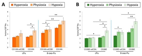 Comparing the accumulation of total 8-oxo-Pu and cPu, a 1.3–1.9-fold higher level for the first one was observed in CS1AN-wtCSB and CS1AN cells, as shown in Figure 2A (see Tables S7 and S9). In CS1AN-wtCSB cells, statistically increased 8-oxo-Pu levels were detected under physioxic and hypoxic as compared to hyperoxic conditions (p = 0.035 and p = 0.027). There is also an increase in 8-oxo-Pu in CS1AN in hypoxia as compared to physioxia and hyperoxia, although there are no statistically significant differences.