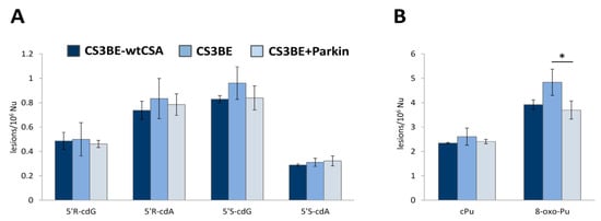 Furthermore, the amount of purine DNA lesions was measured in CSA cells overexpressing Parkin (CS3BE + Parkin) in hyperoxia conditions. It is interesting to note that in CSA cells overexpressing Parkin, a protein involved in mitophagy, all measured lesions were less than those measured in the CSA cells, and approached the levels of the wt cells (CS3BE-wtCSA), although without statistical significance. These results are in agreement with the role of mitochondrial dysfunction in the pathogenesis of CS. In fact, the overexpression of Parkin, eliminating the damaged mitochondria, reverts the CSA phenotype [24]. The elimination of mitochondria, and so the primary source of ROS, via overexpression of Parkin, leads to a reduction in the oxidative induced lesions.