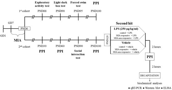 LPS (from Escherichia coli 026:B6, Sigma-Aldrich, St. Louis, MO, USA) was dissolved in saline to obtain a concentration of 2 mg/kg in 1 mL and administrated subcutaneously to pregnant rats of the MIA group from the 7th day (GD7) of pregnancy every second day at 10:00 a.m. until delivery [35,36,37]. Control pregnant animals were receiving the corresponding volume (1 mL/kg) of vehicle (saline). Twenty-one days after birth (PND21), male offspring were separated from dams and housed in groups of five per cage under standard conditions. Before further experiments, the rats were divided into two cohorts: the 1st (both the control and MIA groups) was used only for the behavioural examinations, while the 2nd (both the control and MIA groups) underwent behavioural tests and biochemical analyses. The behavioural experiments were performed between 9:00 a.m. and 12:00 a.m. An overview of the experimental design is illustrated in Figure 1. The investigators were not blinded to the experimental conditions. The numbers of animals included in each analysis are presented in the description of the corresponding figure or table.