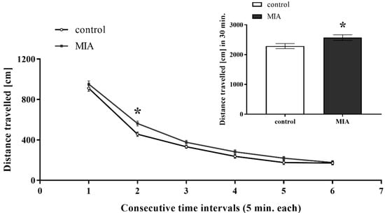 The effect of MIA on the exploratory activity of adult male Sprague-Dawley offspring. The exploratory activity is expressed as a distance travelled (in cm) in respective time intervals (5 min each) and the total distance travelled during 30-min-interval (showed on the inset). n = 42 in the control group, n = 69 in the MIA group. The results are presented as the means ± SEM. * p < 0.05 vs. control group.