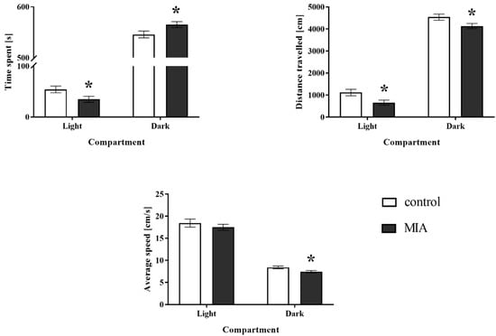 The effect of MIA on anxiety-like behaviours of adult male Sprague-Dawley offspring, measured in the light-dark box test. n = 42 in the control group, n = 69 in the MIA group. The results are presented as the means ± SEM. * p < 0.05 vs. control group.