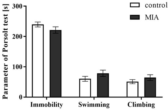 Some behavioural deficits are common both for schizophrenic and schizoaffective patients [50,51]. In the present study, we used the FST to examine whether the adult animals from the MIA group displayed depressive-like behaviour that is a characteristic of affective disorders. The obtained results (Figure 4) revealed that MIA did not affect any analysed parameter (immobility, swimming, and climbing). Therefore, MIA did not induce depressive-like changes in adult male offspring.
