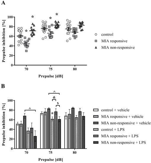 (A) The PPI test at PND100 revealed two distinct behavioural phenotypes: MIA responsive (with the deficit in PPI) and MIA non-responsive (without the deficit) in male Sprague-Dawley offspring exposed to MIA. n = 17 in the control group, n = 9 in the MIA responsive group, n = 10 in the MIA non-responsive group. * p < 0.05 vs. control group. The results are presented as the individual data points of the percentage of PPI (%PPI) induced by each prepulse intensity with the means ± SEM. Data were calculated based on the average startle amplitudes (AVGs). (B) At PND120, the animals were additionally subjected to the acute challenge with LPS and 2 h later, the PPI was evaluated again. n = 4–10. * p < 0.05 vs. control + vehicle, ^ p < 0.05 vs. MIA non-responsive + vehicle, $ p < 0.05 vs. MIA responsive + LPS, & p < 0.05 vs. control + LPS. The results are presented as the means of the percentage of PPI (%PPI) induced by each prepulse intensity ± SEM. Data were calculated based on the average startle amplitudes (AVGs).