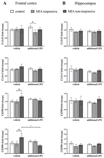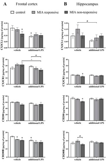 Interestingly, similar to the gene expression patterns, the greatest MIA-evoked changes were observed in the frontal cortex of the MIA non-responsive offspring. The cortical CX3CL1 levels were lowered in the MIA non-responsive (p = 0.0382) and the control (p = 0.0011) groups after the “second hit” with LPS.