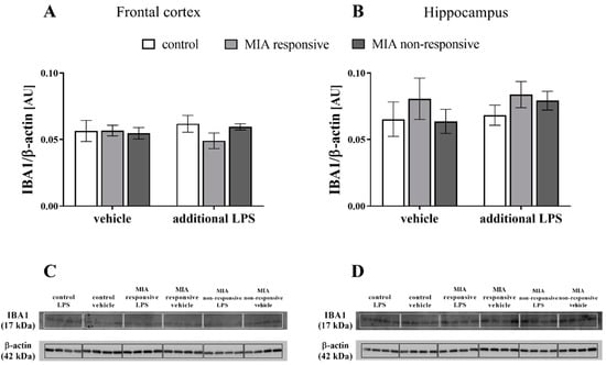 After identifying the changes in microglial CX3CR1 and CD200R levels, we assessed IBA1 levels in the frontal cortices and hippocampi of the adult animals after MIA and the additional challenge with LPS (Figure 8). The Western blot analysis showed no significant differences in either the cortical or hippocampal levels of IBA in the offspring from any examined group.
