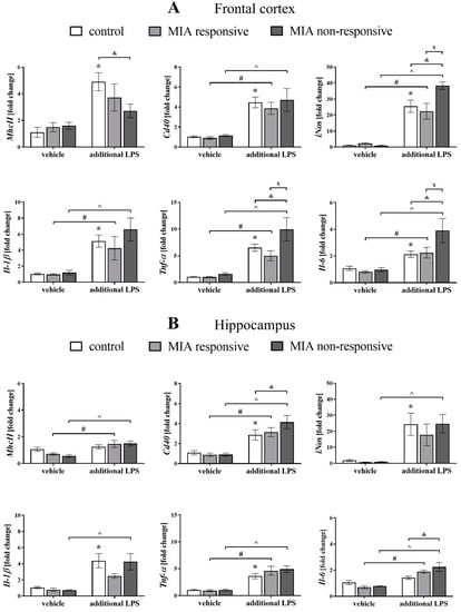 The effect of MIA and the additional acute challenge with LPS on the gene expression of the pro-inflammatory microglial markers: MhcII, Cd40, iNos, Il-1β, Tnf-α and Il-6 in the frontal cortices (A) and hippocampi (B) of male Sprague-Dawley offspring at PND120. The mRNA levels were measured using qRT-PCR with n = up to 10 in each group. The results are presented as the average fold change ± SEM. * p < 0.05 vs. control + vehicle, # p < 0.05 vs. MIA responsive + vehicle, ^ p < 0.05 vs. MIA non-responsive + vehicle, $ p < 0.05 vs. MIA responsive + LPS, & p < 0.05 vs. control + LPS.