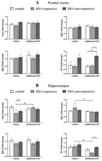 Among the tested markers of the anti-inflammatory phenotype, we observed that in the frontal cortices of the MIA non-responsive rats after the “second hit” with LPS, the mRNA level of Il-4 was higher than in the control (p = 0.0047) and the MIA responsive (p = 0.0127) offspring (Figure 10A). Moreover, the acute injection with LPS increased Tgf-β expression in the control group (p = 0.0157).