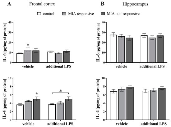 The solution of LPS (from Escherichia coli 026:B6, Sigma-Aldrich, St. Louis, MO, USA) in 1 mL of saline at a concentration of 250 µg/kg was administrated intraperitoneally [38,39] to the male offspring from the control + LPS, MIA responsive + LPS and MIA non-responsive + LPS groups at PND120. The control + vehicle, MIA responsive + vehicle and MIA non-responsive + vehicle groups received an intraperitoneal injection of vehicle (saline) in the corresponding volume (1 mL/kg).