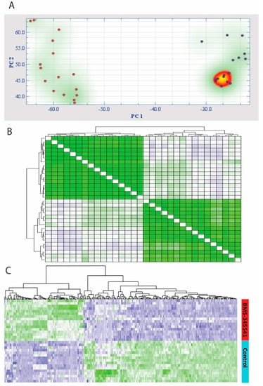 We performed a principal component analysis (PCA) based on the 277 highly discriminative genes; the first principal component was highly discriminative for cells in the intervention cultures compared to cells in control cultures (Figure 1A). This observation was further supported by the highly discriminative hierarchical clustering with distance matrix analysis (Figure 1B), indicating a high degree of correlation between cells in intervention cultures versus control cultures. A hierarchical cluster analysis was finally performed (Pearson’s correlation, complete linkage; Figure 1C. This last analysis showed that the upregulated and downregulated genes in the two distinct clusters were highly consistent through the two groups, and the obtained profile could be used to highly discriminate the intervention and control cell cultures.