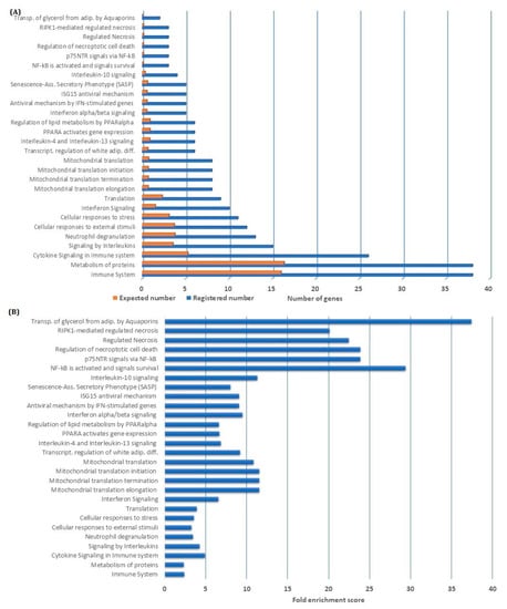 Gene ontology GO enrichment analysis of genes being downregulated by nuclear factor-κB (NF-κB) inhibition: We performed a GO enrichment analysis based on the 183 genes that were downregulated by NF-κB inhibition; the terms Biological Process and Reactome Pathways were used for annotation. The GO-terms identified by a false discovery rate (FDR) <0.05 are presented in the figure. (A) For each of the identified GO-terms, we present the number of identified genes (blue column) and the number of genes that would be expected to be identified by coincidence (orange column). (B) The fold enrichment score, i.e., representing the degree to which the identified downregulated genes are over-represented in the terms, is also presented for the identified GO-terms.