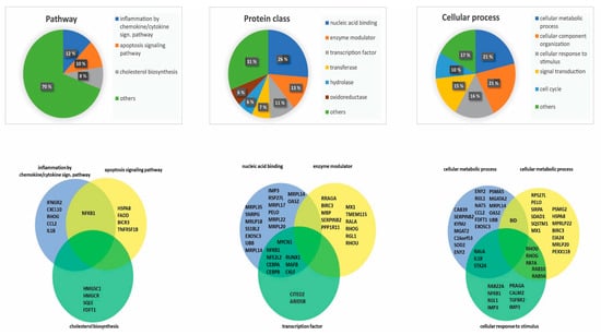 We analyzed the major GO terms associated with the genes that were downregulated by NF-κB inhibition. We used the PANTHER database to classify proteins encoded by the 183 downregulated genes [28]. We then searched for functional classification analysis and used the three major terms (i) Pathway, (ii) Protein class, and (iii) Cellular process (Figure 3). In each of these classes, we further investigated the three largest subcategories/terms. In the setting of pathway analysis, we identified inflammation mediated by the chemokine/cytokine signaling pathway, the apoptosis signaling pathway, and cholesterol biosynthesis to be the three major pathways (Figure 3 left). By investigating the single proteins of these three pathways, we identified several proteins encoded by downregulated genes involved in leukemogenesis, including NFKB1, CXCL10, and IL1B [5,6,29]. In the setting of protein class analysis, we identified nucleic acid binding, enzyme modulators, and transcription factors to be the three largest terms (Figure 3 middle). By investigating single encoding genes of these protein classes, we identified several proteins known to be involved in leukemogenesis, including NFKB1, RUNX1, and CEBPA [6,30,31]. Finally, for the term cellular process, we identified cellular metabolic process, cellular component organization, and cellular response to stimulus as the three major terms (Figure 3 right). By investigating single proteins included in these terms, we identified several proteins previously linked to leukemogenesis, including SOD2, BID, and RALA [32,33].