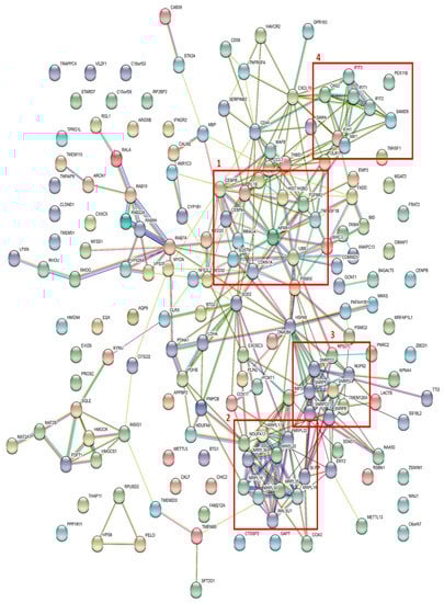 To further investigate whether the identified differences in GEP could be translated to a molecular network profile, we searched for interactions between the proteins encoded by the significantly downregulated genes in BMS-345541 exposed AML cells. We then used the STRING database [27]. Based on these downregulated genes, we identified a network based on a protein–protein interaction (PPI) enrichment p-value < 0.0005, i.e., the identified proteins show significantly more interactions than would be expected by coincidence alone. The results from this network analysis based on the downregulated genes are presented in Figure 4, and we identified four main interaction subsets. The main characteristics of the encoded proteins for each of the four networks are summarized in Table S2: