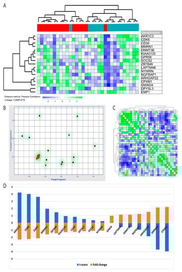 NF-κB has previously been linked to LSCs in AML models [11], and we, therefore, investigated the alterations in a previously identified LSC GEP [14]. These authors identified a 17 gene LSC score based on identified LSC cell fractions, and this score could also be used for prognostication of AML patients [14]. We identified these 17 genes in our microarray data set. AKR1C3 was the only of these 17 genes that was included among the 277 genes that were downregulated after NF-κB inhibition (Table S1). However, we found that the expression profile based only on these 17 genes was consistently altered by NF-κB inhibition, 10 of these genes were then downregulated, and seven genes were upregulated. By performing a hierarchical clustering based on these 17 genes, we found the profile to be highly discriminative between patient cells from control cultures and patient cells exposed to the BMS-345541 inhibitor; there was only one outlier in each group (Figure 5A). These observations were further supported by a principal component analysis based on the LSC gene expression profile, indicating that principal components 1 and 2 were able to identify 32.1% and 15.8% of the variance, respectively (Figure 5B). Furthermore, a hierarchical clustering analysis with distance matrix also illustrated how the 17 gene LSC profiles could discriminate between cells cultured with and without BMS-345541 (Figure 5C). Finally, by performing an ANOVA based on the 17 identified LSC genes, we could identify the t-score and fold change for each individual LSC profile gene, and these results are present in Figure 5D.