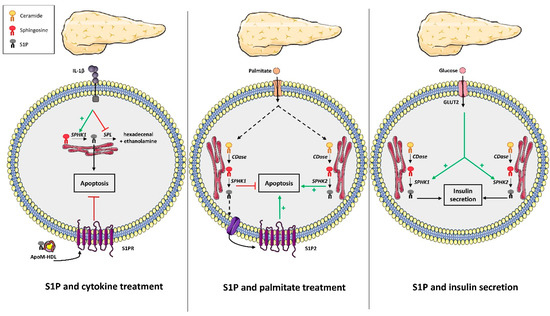 Pancreatic β cells secrete insulin in response to glucose and various hormones to maintain glycaemia and, therefore, regulate glucose homeostasis. However, obesity is associated with deleterious effects of elevated fatty acid levels on pancreatic β cell function and survival. Excessive fatty acids leads to the loss of β cell insulin secretory responsiveness and β cell death by apoptosis, which favors induction of chronic hyperglycemia [18]. Sphingolipids and, in particular, ceramide have been shown to play a central role in pancreatic β-cell apoptosis induced by palmitate [18]. More recently, S1P has also been implicated in mediating β-cell function and viability with a specific role for its metabolizing enzymes.