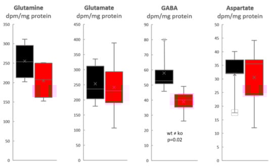 Significant reduction in the newly formed GABA from the astroglia-specific metabolite acetate in Slc38a1−/− mice. Slc38a1+/+ and Slc38a1−/− mice were given an intraperitoneal injection of [2-14C]acetate and sacrificed 10 min after injection to assess the capability of Slc38a1−/− (red) and Slc38a1+/+ (black) mice to synthesize glutamine, glutamate, GABA and aspartate. Values are given as radioactivity/mg protein to show changes in newly made amino acids. Glutamine, glutamate and aspartate are made to the same degree in both genotypes. In contrast, there is a significant reduction in the newly synthesized GABA in Slc38a1−/− (p = 0.02, two-sided paired Student’s t-test). Data are presented as box-and-whisker plots (Excel): whisker is range (highest and lowest observed value), × is mean (average), – is median, box is the interquartile range (middle 50% of the observed values); n = 4 mice of each genotype for GABA and glutamine, n = 5 mice of each genotype for glutamate and aspartate.