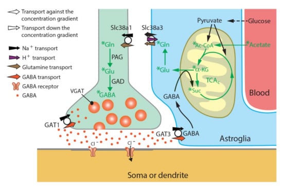 - Battaglioli, G.; Martin, D.L. GABA synthesis in brain slices is dependent on glutamine produced in astrocytes. Neurochem. Res. 1991, 16, 151–156. [Google Scholar] [CrossRef]