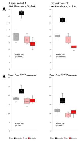 GABA synthesis in nerve endings is rescued by glutamine supplementation in Slc38a1+/+ mice, but not in Slc38a1−/− mice: densitometric analyses. Hippocampal slices from Slc38a1+/+ (wt) and Slc38a1−/− (ko) mice were treated with and without glutamine (gln) as indicated in Figure 3. Data from two experiments are shown as whisker-and-box plots (Excel): whisker is range (highest and lowest observed values), × is mean, − is median, box is the interquartile range (middle 50% of values). (A) Net absorbance (A, representing approximate GABA concentration), measured in 6 squares 20 µm × 20 µm at the Pyr/Ori interface, expressed as % of that in wt. Corresponding “background” readings, in sections processed without GABA antibody (Figure 3F) to measure light absorption in tissue without GABA signal, were subtracted to obtain net GABA signal. (The subtracted “background” absorbance 0.0258 ± 0.0005 (mean ± SD) corresponded to 13% of the net wt absorbance in experiment 1, 8% in Experiment 2) (B) In each measured 20 µm × 20 µm square, the absorbance in the darkest pixel, Amax, and in the lightest pixel, Amin, were subtracted, canceling out “background”, and difference expressed as % of the net mean absorbance in wt (A). This estimates how much the GABA signal in the nerve endings with the highest GABA levels exceeds the “general” GABA signal in tissue elements with low GABA content (with some addition of signal from GABA-containing structures that are out of focus in the measured field).