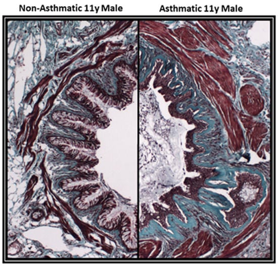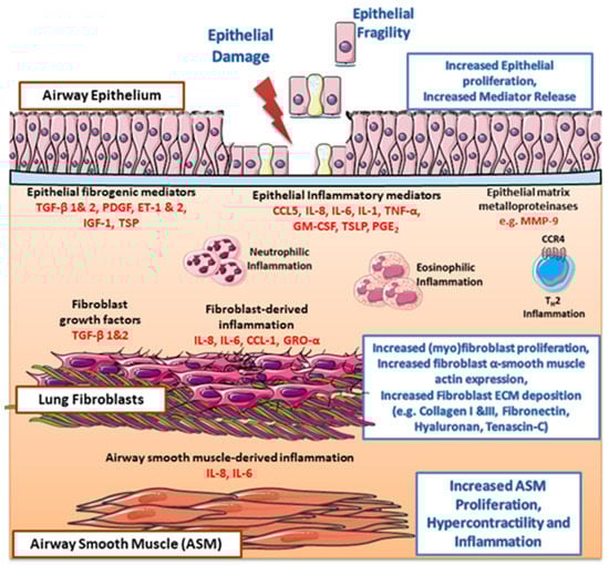 The inflammatory profile of asthmatic patients is very heterogeneous. For patients with allergic asthma, antigen-specific IgE cross-linking of mast cell-surface Fc receptors leads to degranulation and the release of bronchoconstrictors (e.g., histamine and leukotrienes) that cause airways hyperresponsiveness (AHR) [3,4,5,6]. Allergen-exposure also results in chronic airway inflammation due to airway epithelial-derived release of inflammatory mediators leading to T helper 2 (TH2)-inflammation and eosinophilia [5]. In corticosteroid-resistant asthma, chronic inflammation is associated with predominantly neutrophilic-derived mediators [6]. In nonallergic asthma that accounts for 10-33% of patients, they have normal serum IgE levels, and the chronic airway inflammation present consists of increased numbers of neutrophils and activation of the IL-17 pathway [7,8]. In addition to airways hyperresponsiveness, patients may also experience fixed airflow obstruction due to airway remodeling [9]. Histopathological studies of airway remodeling in bronchial biopsies and explanted lung-tissues have shown alterations in airway epithelium (loss of epithelial barrier function, goblet cell hyperplasia), the mesenchyme (airway smooth muscle (ASM) hypertrophy and hyperplasia, increased numbers of myofibroblasts, and angiogenesis) and extracellular matrix (ECM) (thickening of the basement membrane and subepithelial fibrosis) [2,10,11,12] (Figure 1).