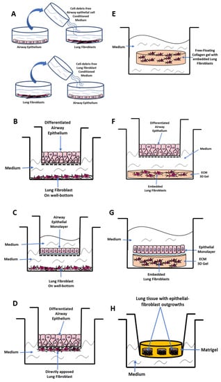 The approach of using co-culture systems is to model the normal physical cell environment and the complex interactions between different cell types and their ECM within the EMTU. The co-culture models used to assess cellular communication in the lung EMTU have included conditioned medium-exposure experiments, epithelial-mesenchymal co-cultures, and 3D-ECM (co-culture) models. These models have been established both with lung epithelial and mesenchymal cell lines [19] and primary cells isolated either from animal models [20] or human asthmatic and control lungs [21].