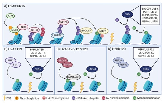 The reversal of histone ubiquitination by DUBs is equally as important, and there is a growing body of evidence detailing how these enzymes contribute to an effective response to damage. There are several important considerations regarding DUBs, the first being that many do not act in isolation. The requirement for adaptor proteins and complex formation is not unique to DUBs involved in DSB repair and importantly, these associations can influence localization and enzymatic activity. Second, a majority of histone-modifying DUBs act on the same substrates, namely H2AK13/15, H2AK119, H2AK125/127/129, and H2BK120. This suggests either functional redundancy or context-dependent activities. The former is illustrated by the roles of USP26, USP29, and USP37, while the ability of USP22 to specifically alter global H2BK120ub levels in B cells supports the latter. As mentioned above, there are indirect mechanisms by which DUBs may influence histone ubiquitination and the crosstalk with additional PTMs. Ultimately, the role of these enzymes in DSB repair may be exploited therapeutically in several disease settings including cancer. The list of ubiquitination machinery provided in this review is most likely far from exhaustive, especially considering no H3 or H4 DUBs have been identified, but nonetheless highlights the importance of these modifications in the response to DSBs.