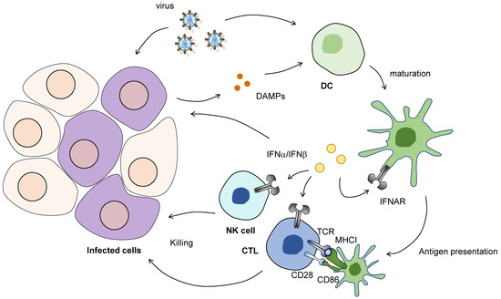 Type I IFNs have multiple functions in the fight against viral infection (Figure 1). Type I IFNs, along with IFN-stimulated genes (ISGs), promote apoptosis of infected cells and confer resistance to viral infection in surrounding uninfected cells [29]. Simultaneously, Type I IFNs induce DC maturation, activate virus-specific cytotoxic CD8 T cells, and enhance the NK cell cytotoxicity. Secreted type I IFNs act on the interferon-α/β receptor (IFNAR), which activates the Janus kinase–signal transducer and the transcription (JAK–STAT) pathway, leading to ISG expression [30]. These sequential events lead to the subsequent activation of adaptive immune cells, characterized by the differentiation of CD4 T cells into a particular subset of helper T cells and antigen-specific antibody production by B cells.
