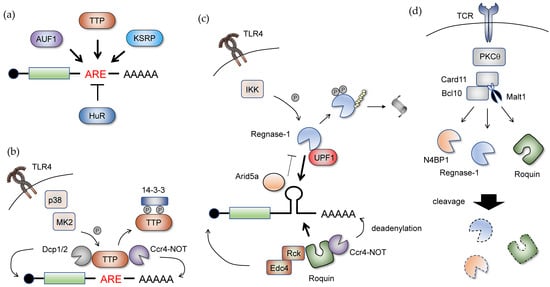 Posttranscriptional mechanisms by RNA-binding proteins (RBPs) regulating mRNA stability. (a) TTP, AUF1, and KSRP are representative RBPs that promote mRNA decay by binding to an AU-rich element (ARE) present in 3′UTR. HuR is an RBP that inhibits mRNA decay by competing for ARE sites. (b) TTP promotes mRNA decay through the recruitment of the deadenylation complex, CCR4-NOT, and Dcp1 and Dcp2 decapping enzymes. This can be suppressed by MK2-mediated phosphorylation of TTP, which is induced downstream of p38 mitogen-activated protein kinase (MAPK) in response to TLR4 activation. The phosphorylated form of TTP is sequestered by the 14-3-3 protein, which results in enhanced stability of target mRNAs. (c) Regnase-1 and Roquin are representative RBPs that recognize stem-loop structures present in 3′UTR. There are two distinct mRNA decay mechanisms: (1) Endonucleolytic cleavage by endonucleases and (2) mRNA decay induced by recruitment of the deadenylation complex and decapping enzymes. (1) Regnase-1 is an endonuclease that recognizes the stem-loop structure, and cooperatively promotes cleavage of target mRNA with UPF1. However, this process can be blocked by Arid5a. In addition, Regnase-1-mediated mRNA decay is also regulated when this protein undergoes IKK-mediated phosphorylation and subsequent proteasomal degradation. (d) Malt1 is a key component of the T cell receptor (TCR)-signaling pathway that contributes to posttranscriptional mechanisms. After the engagement of TCR, Malt1 is activated as a component of the Card11-Bcl10-Malt1 (CBM) complex downstream of PKCθ. Malt1 also acts on a set of substrates for its paracaspase, including Regnase-1, N4BP1, and Roquin. Malt1-mediated cleavage deactivates these proteins.