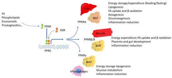- Feige, J.N.; Gelman, L.; Michalik, L.; Desvergne, B.; Wahli, W. From molecular action to physiological outputs: Peroxisome proliferator-activated receptors are nuclear receptors at the crossroads of key cellular functions. Prog. Lipid Res. 2006, 45, 120–159. [Google Scholar] [CrossRef]