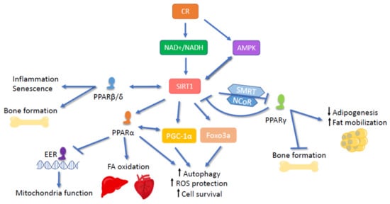 Duszka, K.; Gregor, A.; Guillou, H.; König, J.; Wahli, W. Peroxisome Proliferator-Activated Receptors and Caloric Restriction—Common Pathways Affecting Metabolism, Health, and Longevity. Cells 2020, 9, 1708. https://doi.org/10.3390/cells9071708