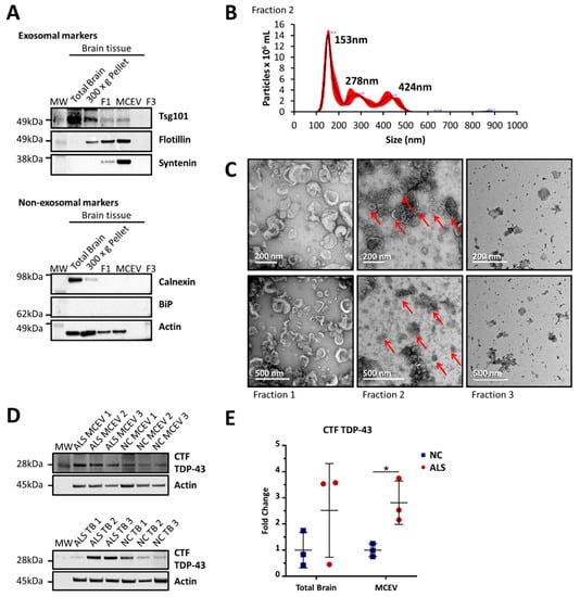 Characterisation of motor cortex extracellular vesicles (MCEVs). MCEVs (fraction 2) isolated from human postmortem brain tissue display the characteristics of small extracellular vesicles (EVs) resembling exosomes and are enriched in C-terminal fragment of TDP-43 (CTF TDP-43). (A). The vesicles in fraction 2 expressed small EV enriched markers tsg101, flotillin and syntenin, and the absence of small EV non-enriched markers; calnexin and binding immunoglobulin protein (BiP). Actin was utilized as a control. This blot is of a neurological control (NC) subject and is representative of n = 15. (B). Nanoparticle tracking analysis of vesicles from fraction 2 analysed by the NanoSight NS300 showed the vesicles appear to be 153 nm in diameter, a size consistent with that of small EVs such as exosomes. The peaks at 278 nm and 424 nm in fraction 2 can be attributed to the aggregation of these vesicles. This result is of a representative NC subject. (C). Transmission electron microscopy (TEM) images of the fractions display a population of small EVs with the size of 40–200 nm in fraction 2. Contrastingly, fraction 1 and 3 appear to contain a heterogeneous population of large EVs and small EVs, respectively. This image is of a representative NC subject. (D). Amyotrophic lateral sclerosis (ALS) MCEVs appear to be enriched in CTF TDP-43 compared to NC MCEVs (E). CTF TDP-43 expression is statistically significantly greater in ALS MCEVs compared to NC MCEVs. All protein levels were normalised to actin expression and averaged across NCs. Graphs were created using GraphPad 8. ALS n = 3 and NC n = 3, Mean ± SEM, * p < 0.05. Statistical significance found using Student’s t-test, with alpha = 0.05.