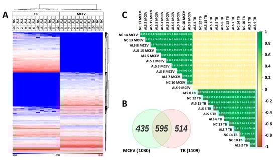 Differential proteomic profiles of MCEVs and total brain samples (TBs) of ALS and NCs. (A). Heat map depicting the relative abundancy of proteins enriched in TBs, MCEVs and common in both (label-free quantification (LFQ) values are presented in Supplementary Table S1). Protein IDs present in at least one subject across TBs and MCEVs are represented. MaxLFQ was used for analysis []. (B). Venn diagram depicting common and unique proteins identified in TBs and MCEVs. Cut off is 1 in TBs and MCEVs = present. (C). Correlation plot between TBs and MCEVs. The protein composition of MCEVs is similar across both ALS and NC and distinct from that of TBs. ALS TB n = 8, NC TB n = 4, ALS MCEVs n = 8 and NC MCEVs n = 3.