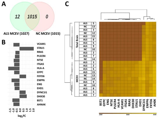 Differentially packaged proteins between ALS and NC MCEVs. (A). Venn diagram depicting number of protein IDs present in ALS MCEVs and NC MCEVs. Cut off is 2 in NC samples and 3 in ALS samples = present. (B). Bar graph showing statistically significant differentially packaged proteins in ALS MCEVs compared to NC MCEVs. LFQ-normalised and weighted for differential expressed analysis (MaxLFQ values are presented in Supplementary Table S2). ALS MCEVs n = 7 and NC MCEVs n = 3. (C). Heat map depicting relative abundancy of statistically significant enriched proteins in MCEVs compared to TBs.
