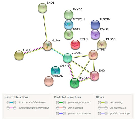 The mass spectrometry run detected 1027 proteins in ALS MCEVs and 1015 proteins in NC MCEVs. Although all the proteins found in NC MCEVs were also present in ALS MCEVs, there were 12 unique proteins (CD177, CHMP4B, CSPG5, DYNC1I2, IGHV3-43, LBP, RPS29, S100A9, SAA1, SCAMP4, SCN2B and SLC16A1) found only in ALS MCEVs (Figure 3A). The mass spectrometry results identified 16 proteins to be statistically significant differentially expressed between ALS and NC MCEVs however, there were no differentially expressed proteins discovered between ALS and NC TBs. The majority of these proteins appeared to mainly be downregulated in the ALS MCEVs compared to NC MCEVs (Figure 3B). Of these proteins, only STAU1, FXYD6, DYNC1I1 and DHX30 were found to be more abundant in ALS MCEVs compared to NC MCEVs (Figure 3B and Supplementary Table S2). The ALS and NC MCEVs exhibited varying relative abundance across the 16 proteins (Figure 3C). Following refinement, the 16 differentially expressed proteins underwent search tool for the retrieval of interacting genes/proteins (STRING) analysis to identify whether any of the proteins were interacting partners. Several deregulated MCEV proteins appear to exhibit network relationships, including GYPC, HLA-A, VCAM-1, ITGA5 and ENG (Figure 4). Gene ontology (GO) enrichment analysis was also performed on the 16 differentially expressed proteins to identify specific changes that may play an important role in ALS. While those enriched in ALS MCEVs compared to NC MCEVs could be used to develop future CSF and blood-based EV biomarkers. GO enrichment analysis was not performed on TB samples as there were no differentially expressed proteins observed in ALS TBs compared to NC TBs.
