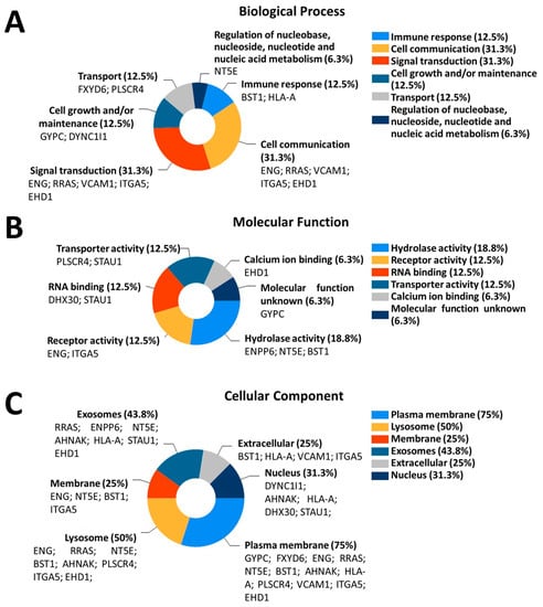 GO enrichment of the 16 proteins found to be differentially packaged in ALS MCEVs compared to NC MCEVs. (A). Biological process: The differentially expressed proteins appear to be involved mainly in cell communication and signal transduction. (B). Molecular function: The differentially expressed proteins appear to exhibit hydrolase activity, receptor activity, RNA-binding and transporter activity. (C). Cellular component: The differentially expressed proteins appear to be overwhelmingly sequestered to the plasma membrane, followed by lysosome and exosomes. Graphs were created on FunRich3.1.3 [].