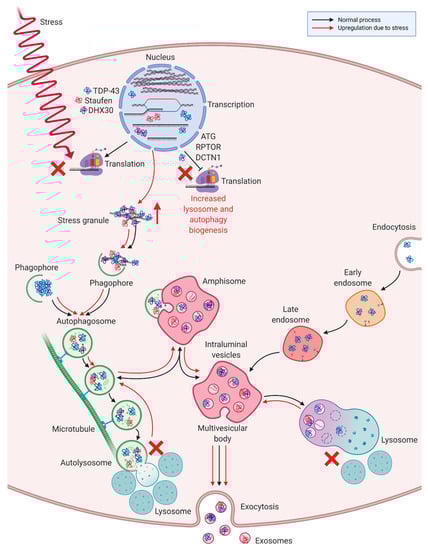 The 16 statistically significant differentially packaged proteins in ALS MCEVs were discovered to associate with the plasma membrane, lysosomes and exosomes, the latter of which further alludes to the exosomal identity of MCEVs. The detection of lysosomal components in ALS MCEVs alludes to an interaction with exosomal biogenesis. Lysosomes are involved in degrading cellular material sent to them through autophagy processes, such as macroautophagy, a process that sends organelles and cytosolic fractions for degradation [,,]. The process of macroautophagy exhibits several similarities with exosomal biogenesis including fusion with MVBs and the employment of ESCRT proteins [,,,]. These similarities have led to the suggestion that lysosomal dysfunction may be compensated for by exosome secretion during the accumulation of misfolded proteins [,,,,]. Thus, given the close relationship between autophagy and exosomal generation, an increase in lysosome cellular components in ALS MCEVs may be indicative of an attempt by the diseased cells to compensate for lysosomal dysfunction via loading MCEVs with certain proteins. Furthermore, TDP-43 positive stress granules and protein aggregates have been shown to be cleared by macroautophagy [,,]. Inhibition of autophagy has previously been reported to significantly increase TDP-43 aggregate levels in exosomes, implicating exosomes in TDP-43 clearance and potentially in the subsequent propagation of TDP-43 proteinopathy []. Furthermore, autophagy markers beclin-1 and LC3-II have been documented to be upregulated following overexpression of TDP-43 CTFs []. Additionally, TDP-43 has been found to transcriptionally regulate proteins involved in autophagy, such as ATG7, RPTOR and DCTN1 [,,]. However, the aggregation of TDP-43 impedes this resulting in upregulated lysosome and autophagy biogenesis and further TDP-43 accumulation [,,]. This study reports an increase in lysosomal sequestering in addition to, an upregulation in RNA-binding stress granule associated proteins STAU1 and DHX30, in ALS MCEVs as observed by proteomics analysis. This finding suggests ALS MCEVs are undergoing selective packaging of stress granule proteins known to interact with TDP-43 [,,]. This may be an attempt by the cells to counteract TDP-43 positive stress granule aggregation and the subsequent lysosomal congestion it results in following clearance through the macroautophagy pathway (Figure 6).