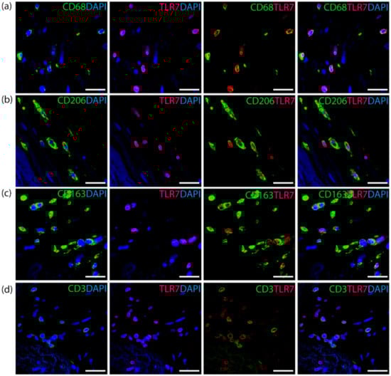 3.2. TLR7 Co-Localizes with T Cells and the M2 Macrophage Subset in Aortic Valves