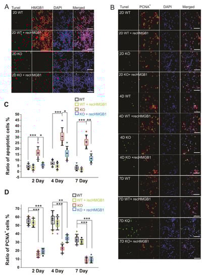 After culturing of 2 days, there were more apoptotic cells in the HMGB1 KO cell culture than in the WT cell culture (Figure 3A). The apoptosis in the HMGB1 KO cells after culturing for four days and seven days was higher than in WT cells after culturing only for two days (Figure 3B). The apoptotic level of the cell cultures was analyzed with Tunel fluorescent staining (Figure 3C). In the HMGB1 KO cells cultured for two days, there were over 10% apoptotic cells. In four days and seven days, the apoptotic cells in the HMGB1 KO cultures were about 30% of the cell population (Figure 3C). The WT cell culture showed very low apoptosis at these time points (Figure 3A,B). We found the apoptosis of the HMGB1 KO cells to be dramatically decreased by the addition of exogenous recombinant HMGB1 (10 μg, but the WT cells were not affected by adding recombinant HMGB1 (Figure 3C).