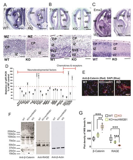 In addition, we have systematically investigated the expression of developmental transcriptional factors and other relevant genes that are involved in neurogenesis and differentiation in the developing brain by qRT-PCR (Figure 7D). When compared with the WT controls, the E16 embryonic brain of the HMGB1 KO showed decreased expression of several neurogenesis factors, such as Ascl1, Neurod1, Sox2, Tbr2, and Bcl2. The HMGB1 KO also had significantly decreased expression of the developmental factors Pax6, Shh, Foxg1, and Emx2. Coincidently, the expression of the differentiation factors BMP2, BMP4, and Tgfβ1 in the HMGB1 KO embryos were downregulated. Not surprisingly, the HMGB1 KO displayed approximately 20% lower expression of neuronal growth factors Fgf2, BDNF, and GDNF. Interestingly, the expression of the synaptogenesis factor Ache was decreased by about 70% in the HMGB1 KO embryo as compared to the WT control. In contrast, the level of the apoptotic signals indicator ApoE was 20% higher in the HMGB1 KO than in the WT. The Wnt1 and Wnt3 levels in the HMGB1 KO were about 80% higher than in the WT controls. This confirmed the increased Wnt/β-catenin signaling in the HMGB1 KO developing brain. The results of anti-β-Catenin antibody immunostaining and western blotting with E16 cortical neuronal cultures clearly showed that Wnt/β-catenin expression was significantly elevated in HMGB1 KO cells (Figure 7E,F). The HMGB1 KO cells that were supplied with recombinant HMGB1 expressed much less Wnt/β -catenin than the KO, but still around 20% more than the WT (Figure 7G). In addition, we detected strongly decreased RAGE expression in the HMGB1 KO cells, which was significantly upregulated by supplying with recombinant HMGB1 (Figure 7F,G). The reversal of the changes in the KO cells by recombinant HMGB1 confirms that HMGB1 can regulate Wnt/β-catenin and RAGE signaling, and the effects in the KO cells cannot be explained by irreversible nonspecific effects.