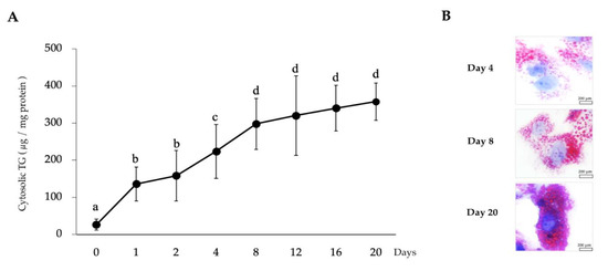 Long-term adipogenic differentiation mediated fat accumulation into the porcine intramuscular preadipocyte (PIP) in vitro culture. The PIP cells (2.5 × 104/cm2) were kept in vitro culture for 20 days with differentiation medium, and cells were harvested at different time points to estimate the degree of cytosolic fat accumulation by using a triglyceride (TG) assay kit (A). Data shown are the mean ± SD of three independent experiments performed in triplicates. Different letters (a, b, c, and d) labeled upon the time points indicate significant differences (p < 0.05), while the same letter indicates no significant difference between the contrast pairs. Oil red O staining of adipocytes demonstrated the fat droplets red color while the nucleus takes a blue color when observed under microscope (B).