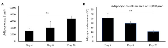 The size of the adipocytes was also progressively increased over the longer period of differentiation (Figure 2A). The average number of live adipocytes (as estimated in a stained area of 10,000 μm2) was significantly decreased over time (Figure 2B).