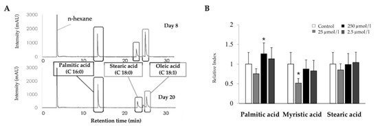 The release of free fatty acids by adipocytes during LTAD was also investigated (Figure 3A). Since the fat accumulation reached its relative stationary phase at day 8 and continued until day 20, the FFA contents of adipocytes were measured at day 8 and 20 of differentiation. There were no remarkable differences of palmitic acid (C 16:0), stearic acid (C 18:0) and oleic acid (C 18:1) contents in the culture supernatant measured between days 8 and 20 (Figure 3A). However, the stearic acid: oleic acid ratio was changed by the LTAD.