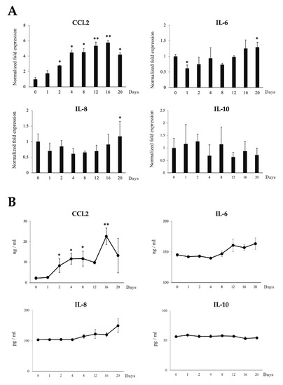 Long-term adipogenic differentiation mediated expression dynamics of adipokines in the adipocytes without any exogenous inflammatory triggers. The mRNA expression (A) and protein concentration (B) of CCL2, IL-6, IL-8 and IL-10 in adipocytes over the 20 days of culture as measured by RT-qPCR and ELISA, respectively. Data shown are the mean ± SD of three independent experiments performed in triplicates. The asterisks: (*) and (**) indicated statistical differences when compared with day 0 at the significance levels of p < 0.05 and p < 0.01, respectively.