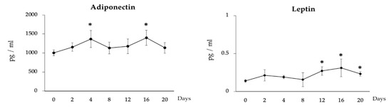 Long-term adipogenic differentiation mediated secretion of adiponectin and leptin in adipocytes. The ELISA-based quantification of adiponectin and leptin concentration in adipocytes as measured over the 20 days of culture. Data shown are the mean ± SD of three independent experiments performed in triplicates. The asterisk (*) indicated the statistical differences of protein concentration when compared with day 0, at the significance level of p < 0.05.