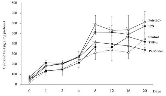 In order to evaluate the effect of TNF-α and TLR ligands on the fat accumulation of porcine adipocytes, the cytosolic TG content was estimated. Progressive fat accumulation was observed in TNF-α and TLR-ligands stimulated adipocytes as well as in unstimulated cells (Figure 6). Interestingly, fat deposition rate was accelerated in adipocytes challenged with TLR3 or TLR4 ligands since significantly higher levels of TG were found from day 8 until the end of the studied period when compared to controls. On the other hand, TNF-α and TLR2 ligand stimulation did not result in significant changes in fat deposition as compared to control adipocytes at the end of the study period (Figure 6).