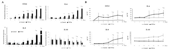 We next aimed to evaluate whether the stimulation with TNF-α was able to change the expressions of four adipokines in porcine adipocytes during LTAD. As observed in non-stimulated control adipocytes, TNF-α-challenged adipocytes showed a progressive augment in CCL2 expression and protein concentration (Figure 7). However, adipocytes under TNF-α stimulation had significantly higher levels of CCL2 mRNA (Figure 7A) and protein (Figure 7B) when compared to unchallenged controls. In fact, CCL2 expression in controls was up-regulated four-fold at day 2 while in TNF-α stimulated adipocytes this adipokine increased more than 20-fold when compared to basal levels. Similarly, both mRNA and protein levels of IL-8 and IL-6 were increased from day 8 (Figure 7) and their values were significantly higher when compared to unchallenged adipocytes. Interestingly, mRNA levels for IL-10 were significantly reduced in TNF-α-challenged adipocytes already from day 8 onwards. In addition, a slight but not significant decrease in IL-10 protein concentration was observed after 20 days of LTAD (Figure 7B).