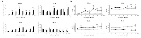 In order to investigate the effects of TLR4 activation during LTAD, adipocytes were challenged with Pam3CSK4 or LPS, respectively (Figure 9). TLR4 activation also resulted in a significant up-regulation of CCL2, IL-6 and IL-8 (Figure 9A,B). Particularly, the TLR4-activated adipocytes showed a sustained increase in CCL2 mRNA (Figure 9A) and protein concentration (Figure 9B) from day 1 of LTAD, while IL-8 and IL-6 were up-regulated from days 8 and 12, respectively (Figure 9A,B). On the contrary, both mRNA expression (Figure 9A) and protein concentration (Figure 9B) of IL-10 were significantly reduced after TLR4 activation.