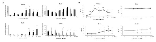 Total RNA was isolated from treated and untreated cells using TRIzol reagent (Invitrogen) according to our previous study [17]. The cDNAs were synthesized using a Quantitect reverse transcription (RT) kit (Qiagen, Tokyo, Japan) according to the manufacturer’s protocol. The RT-qPCR was performed with an Applied Biosystems Real-time PCR System 7300 (Applied Biosystems, Warrington, UK), using the Platinum SYBR Green qPCR SuperMix-UDG (uracil-DNA glycosylase) with ROX (6-carboxyl-X-rhodamine) (Invitrogen). The sequences of primers for CCL2, IL-6, IL-8, IL-10 and β-actin used for this study are available in our previous publications [17,34]. The PCR thermal cycling conditions were 5 min at 50 °C, followed by 5 min at 95 °C, and then 40 cycles of 15 s at 95 °C, 30 s at 60 °C, and 30 s at 72 °C. The reaction mixtures contained 2.5 μL of sample cDNA and 7.5 μL of master mix including the sense and antisense primers. Each reaction ran in duplicate and the expression of β-actin in each sample was used as a reference to normalize differences between samples and to calculate the normalized fold expression of target genes.